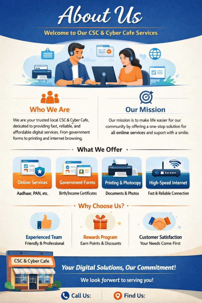 About Us Welcome to Our CSC & Cyber Cafe Service Who We Are We are your trusted local CSC & Cyber Cafe, Dedicated to provinding Fast, realabe and affordable digital service . Our Mission Our mission is to make life easier for our community by offering a one stop solution for all online service and suport with a smale. .................What We Offer............... Company Adress